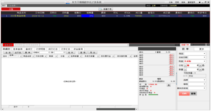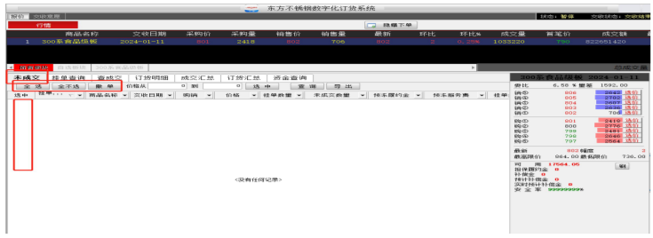 2.登录之后,进入客户端首页默认界面,如图 2-4,上半部分显示的是市场行情,下半部分左方为交易查询列表,中间为分档位报价小行情,右方为下单框。
