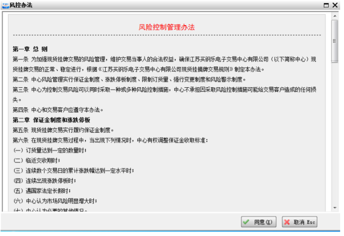 如下图 2-2, 客户可以用发送至手机上的 摊位号登录,也可以用注册的手机号登录。登录客户端前,客户须仔细阅读《风险控制管理办法》的内容,并勾选“同意风控办法”后方可登录。若是第一次登录,客户端会自动弹出风控办法界面(图 2-3),客户须仔细阅读《风险控制管理办法》的内容后方可点击“同意”按钮登录客户端。