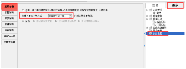 默认的交易客户端的下单框为竖向框,在整个界面的右下方,如图 4-1,客户可根据自己的使用习惯在“更多-参数设置-系统参数”中设置下单框的样式,图 4-2。