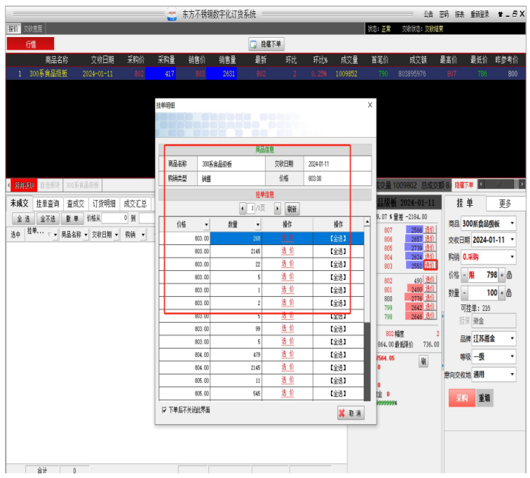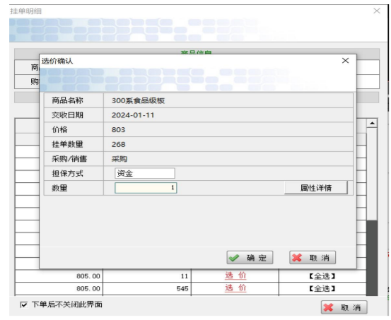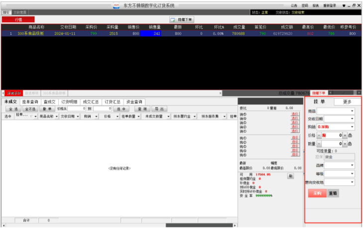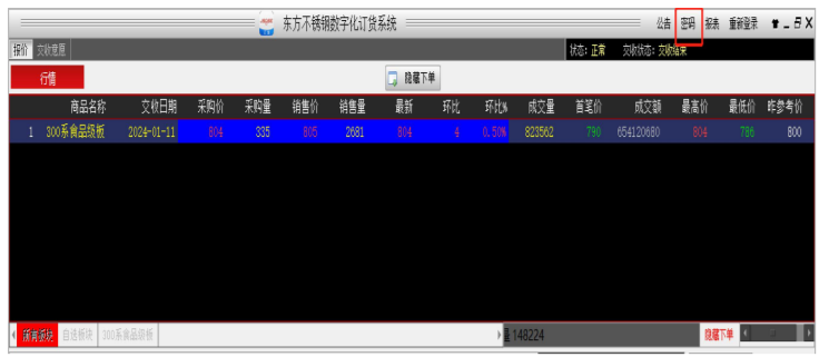 (2) 客户也可在大行情上点击某合同,此时下单框中自动提取该合同信息,客户须自行选择做单方向,则价格及数量默认为对手方挂牌价格以及可下单量,直接确认则即时成交,客户亦可自行修改价格以及数量进行挂牌等待成交。
