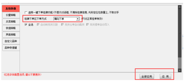 可选择“横向下单”,点击右下角“应用”进行确认(图 4-3),则下单框显示为如下图 4-4。