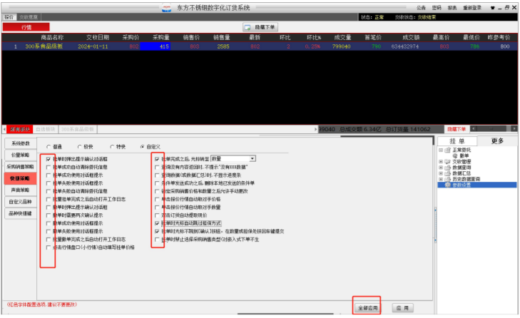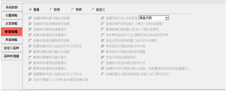 快捷策略里勾选的为系统默认设置,客户可根据操作习惯,点击“自定义”进行选择性设置,如图 4-5,为减少因对系统的不熟悉而造成的误操作,建议客户使用自定义设置。