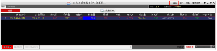 市场发布的最新公告,客户端会自动弹出公告窗口显示公告内容,如果关闭此窗口后,可点击右上角“公告”按钮(图 4-6),即可弹出公告窗口。
