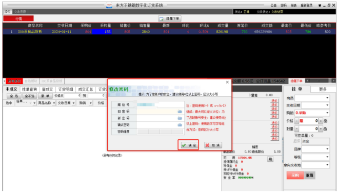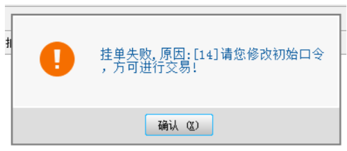 客户登录交易客户端,首次交易前,须先点击右上角“密码”按钮(图 4-7),进入密码修改界面(图 4-8)修改密码,建议使用 6 位以上数字与字母组合密码,若未修改密码进行交易的,系统将报错(图 4-9)。