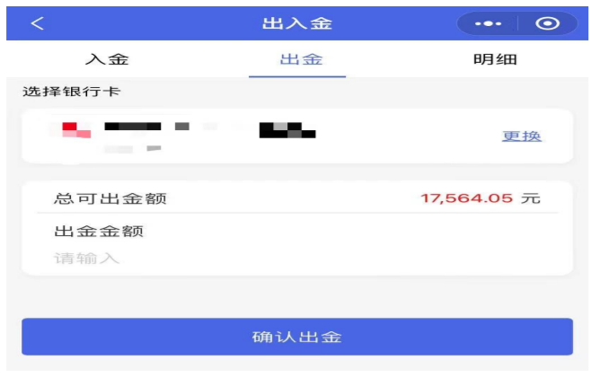 在“出入金”界面(图 4-16),输入出金划转的金额,点击“确认出金”,即向市场发送了出金指令,并可在“明细”中查看状态。