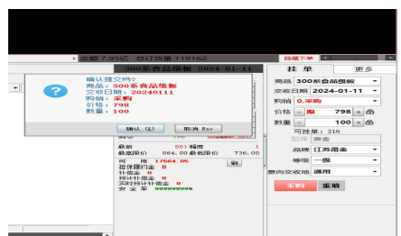 (1) 客户登录交易客户端后,在下单框中选择某一交收日期的合同,如图 5-1,并自行输入挂牌方向、价格及数量,点击下方“采购”或“销售”按钮后,再次对挂单 信息进行确认(图 5-2),即挂牌成功。
