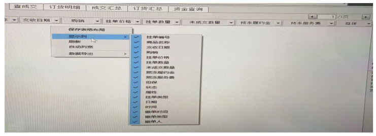 “挂单查询”的查询项目较多,客户可点击鼠标右键,在“显示列”中设置关注的项目,如图 5-7。