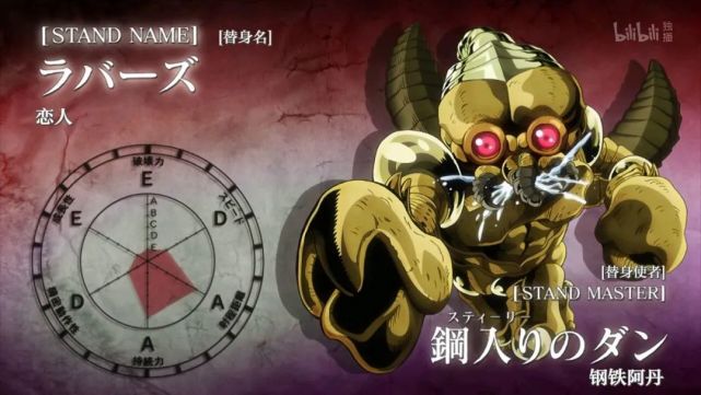 替身恋人的数据面板,破坏力E速度D 射程距离A持续力A 精密度A 成长性E。面板属性上就是战五渣,但是就是能力有点儿卑鄙。