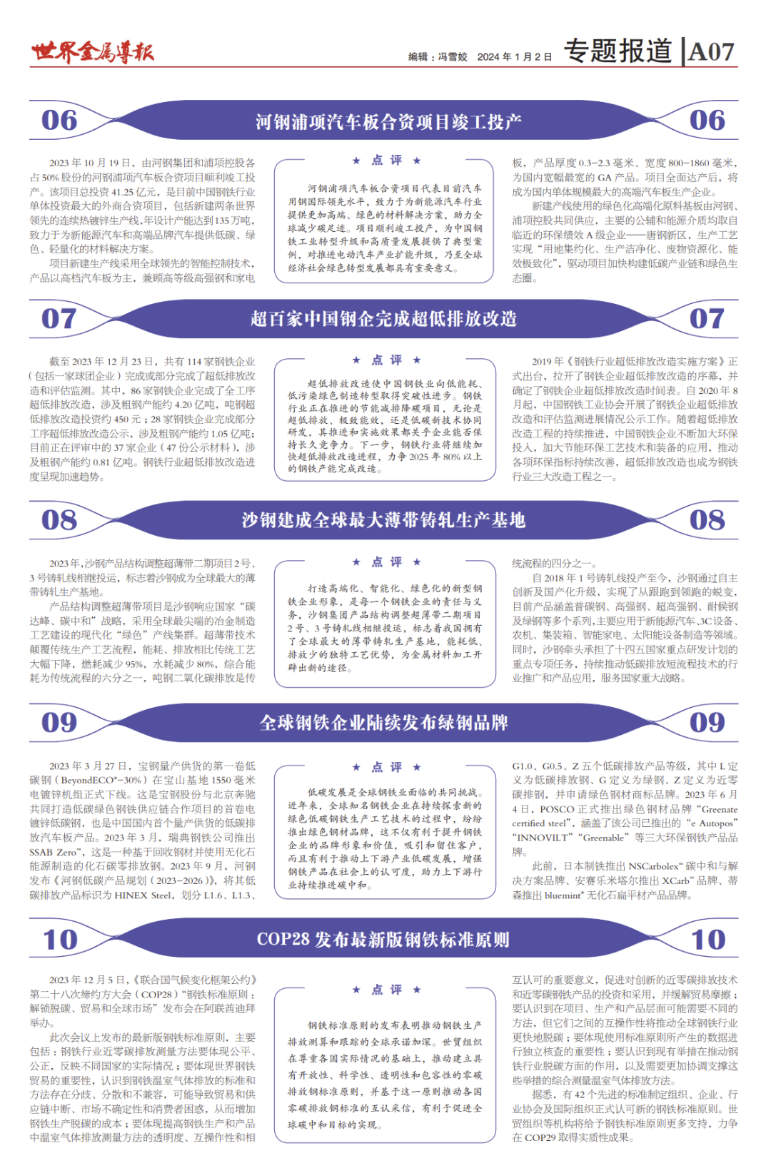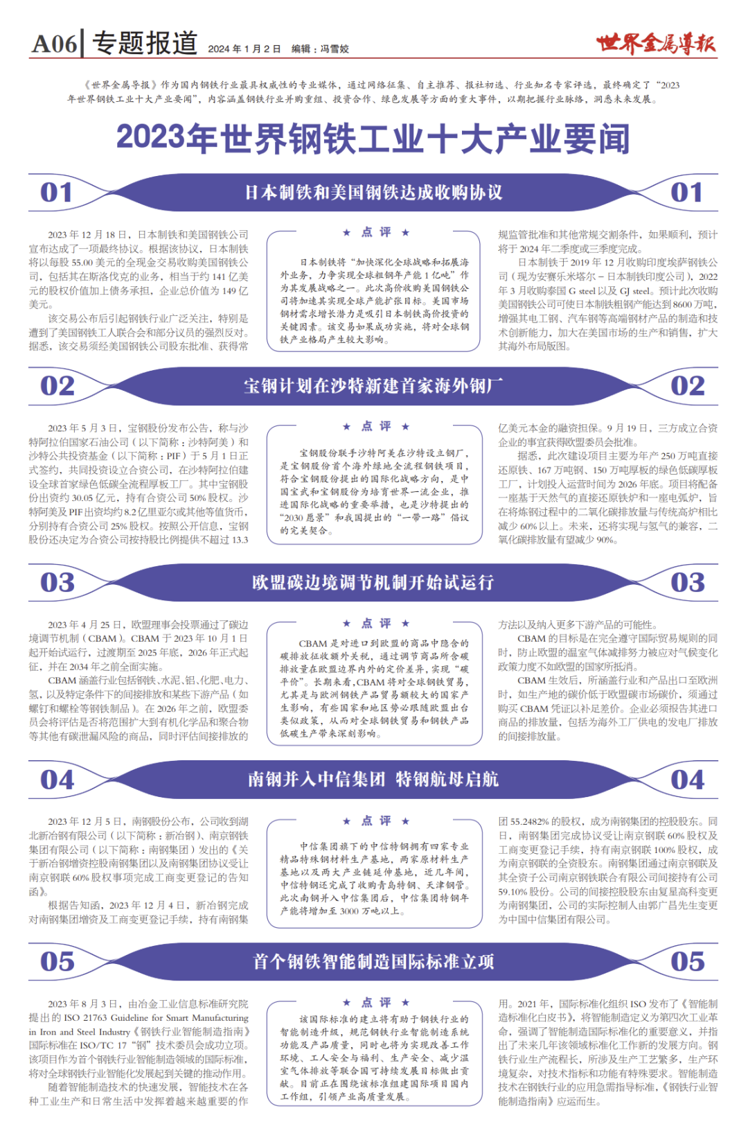 《世界金属导报》作为国内钢铁行业最具权威性的专业媒体,通过网络征集、自主推荐、报社初选、行业知名专家评选,最终确定了“2023年世界钢铁工业十大产业要闻”,内容涵盖钢铁行业并购重组、投资合作、绿色发展等方面的重大事件,以期把握行业脉络,洞悉未来发展。